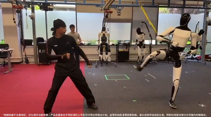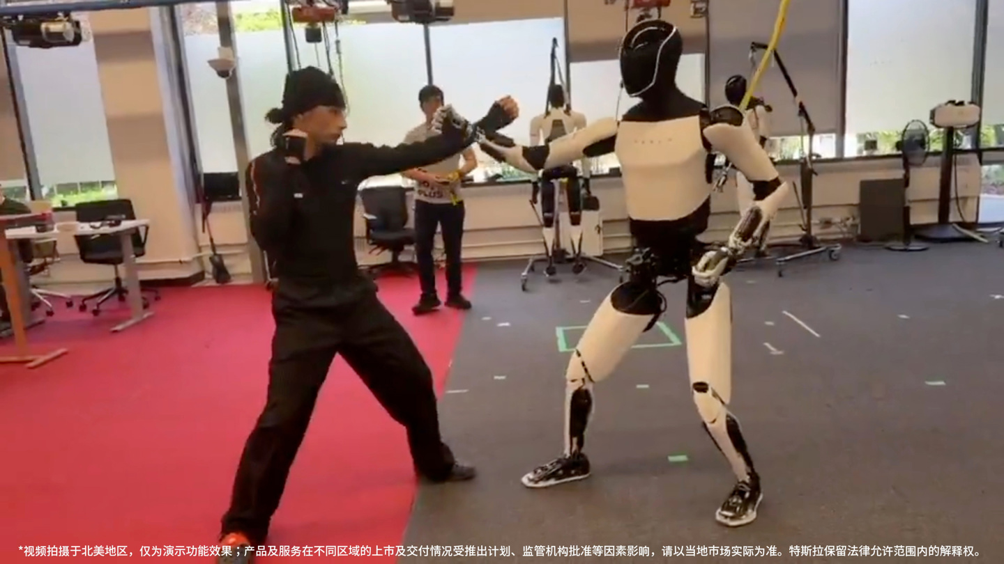 从视频画面可以看到,特斯拉人形机器人与“对手”进行了战前互动,随后主动让“对手”先出招。对局中,特斯拉人形机器人先后展示了对拳、挥拳、格挡等动作,并挡下了“对手”的拳击、脚踢等攻击,最后被“对手”推开几步后,摆拳踢腿再次摆开了格斗架势。