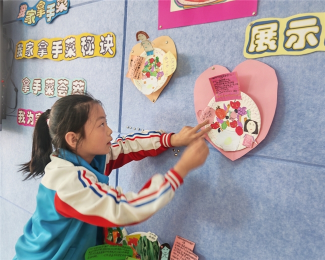 “亲情课堂——我家拿手菜”活动中,孩子们用拼贴画做出自家的拿手菜。